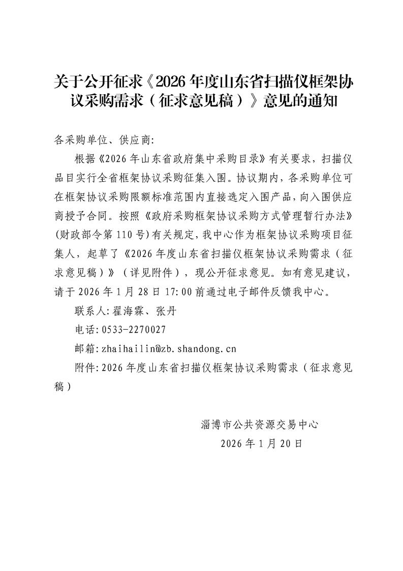 关于公开征求《2026年度山东省扫描仪框架协议采购需求(征求意见稿)》意见的通知