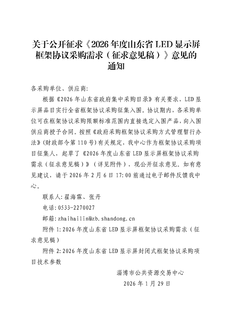 关于公开征求《2026年度山东省LED显示屏框架协议采购需求(征求意见稿)》意见的通知