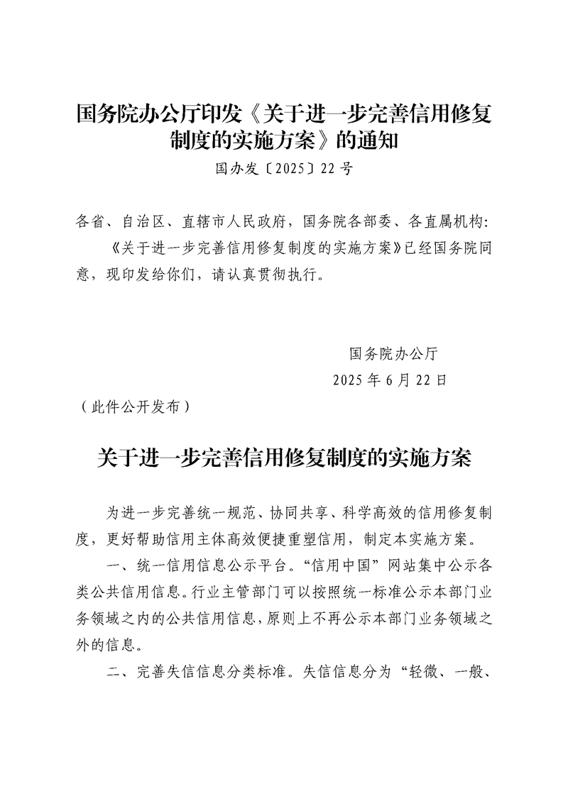 国务院办公厅印发《关于进一步完善信用修复制度的实施方案》的通知