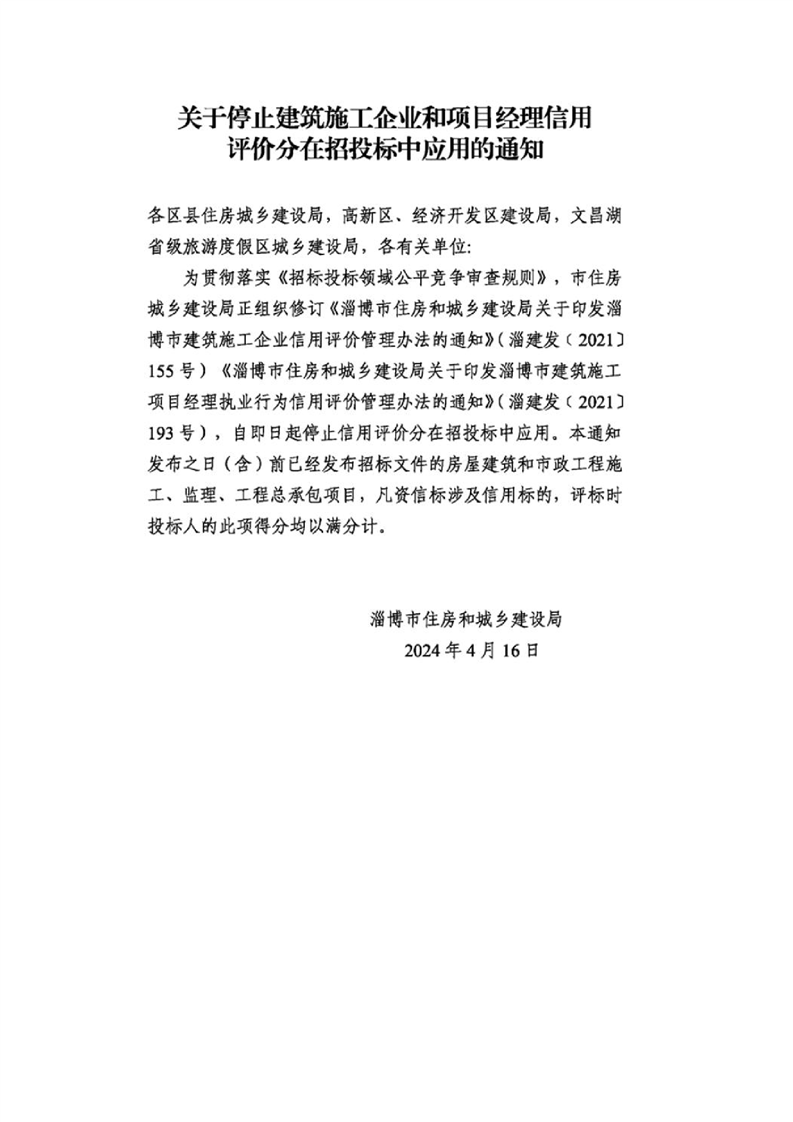 淄博市住房和城乡建设局关于停止建筑施工企业和项目经理信用评价分在招投标中应用的通知