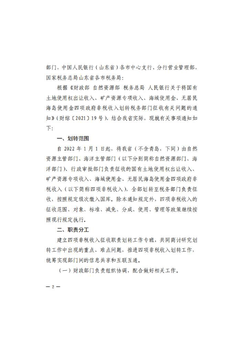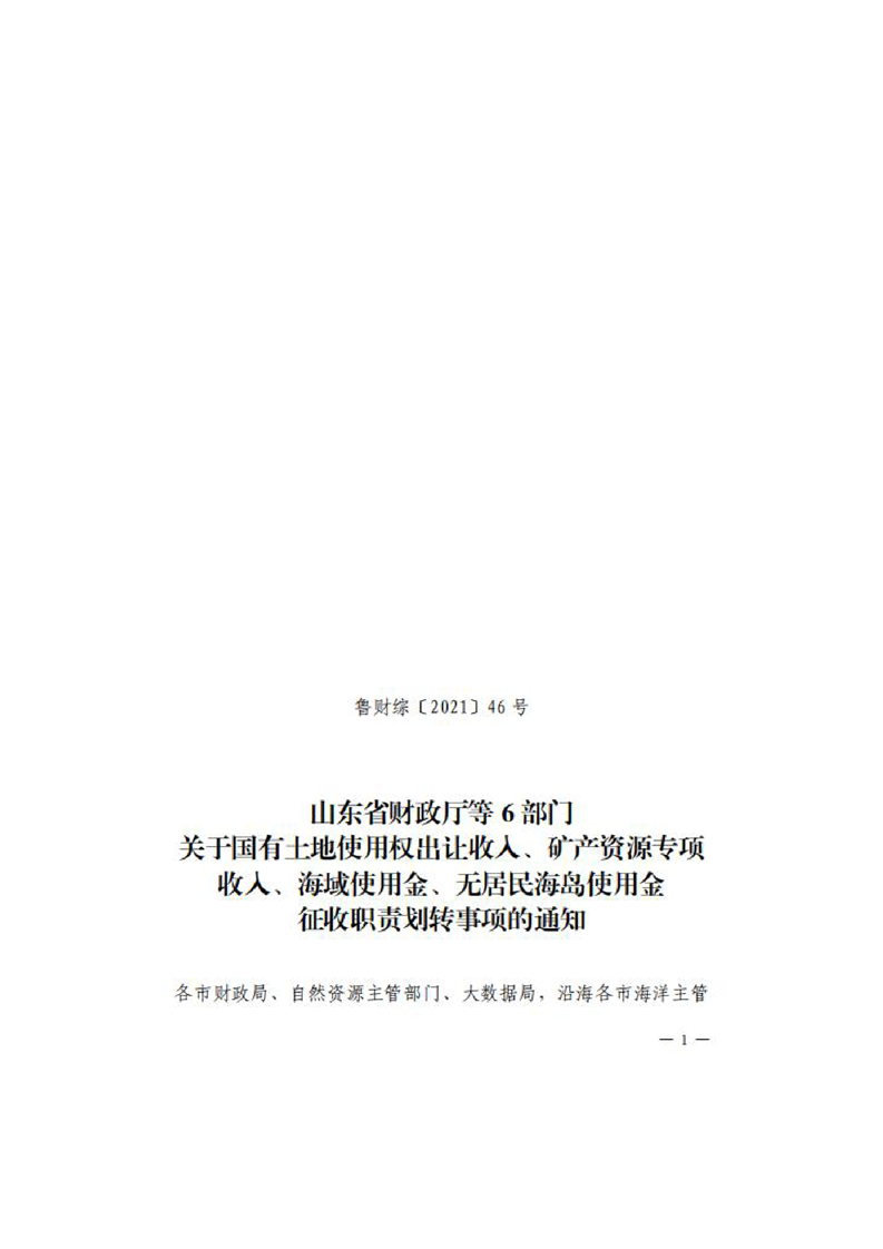 山东省关于国有土地使用权出让收入、矿产资源专项收入、海域使用金、无居民海岛使用金征收职责划转事项的通知(鲁财综(2021)46号).pdf