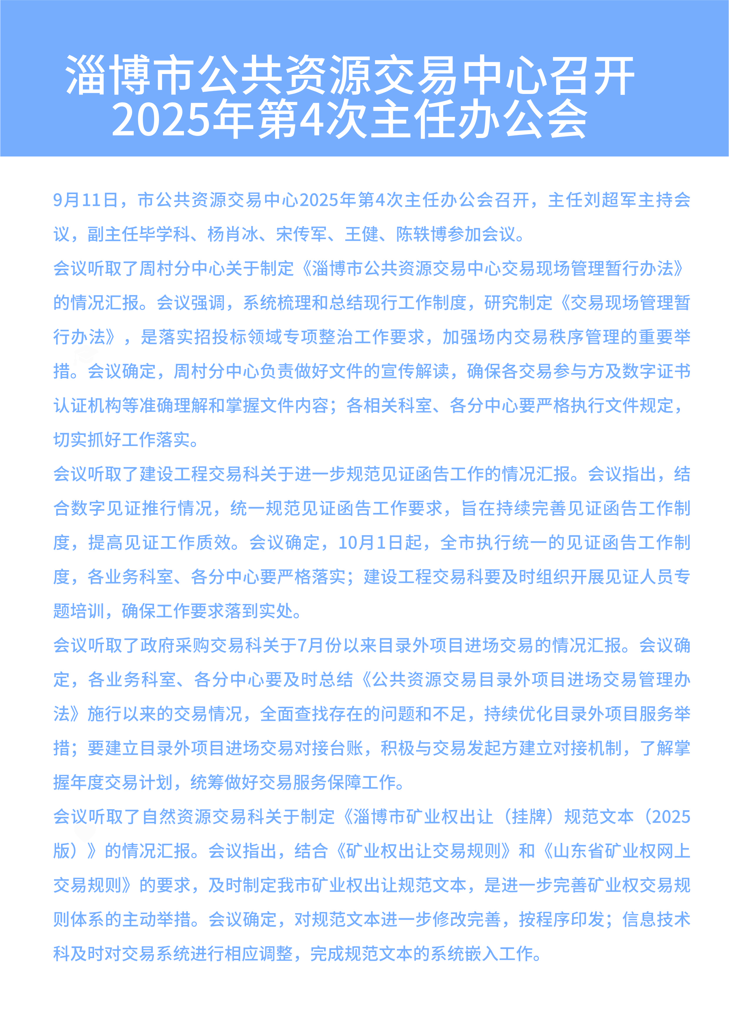 会议听取了自然资源交易科关于制定《淄博市矿业权出让(挂牌)规范文本(2025版)》的情况汇报。会议指出,结合《矿业权出让交易规则》和《山东省矿业权网上交易规则》的要求,及时制定我市矿业权出让规范文本,是进一步完善矿业权交易规则体系的主动举措。会议确定,对规范文本进一步修改完善,按程序印发;信息技术科及时对交易系统进行相应调整,完成规范文本的系统嵌入工作。